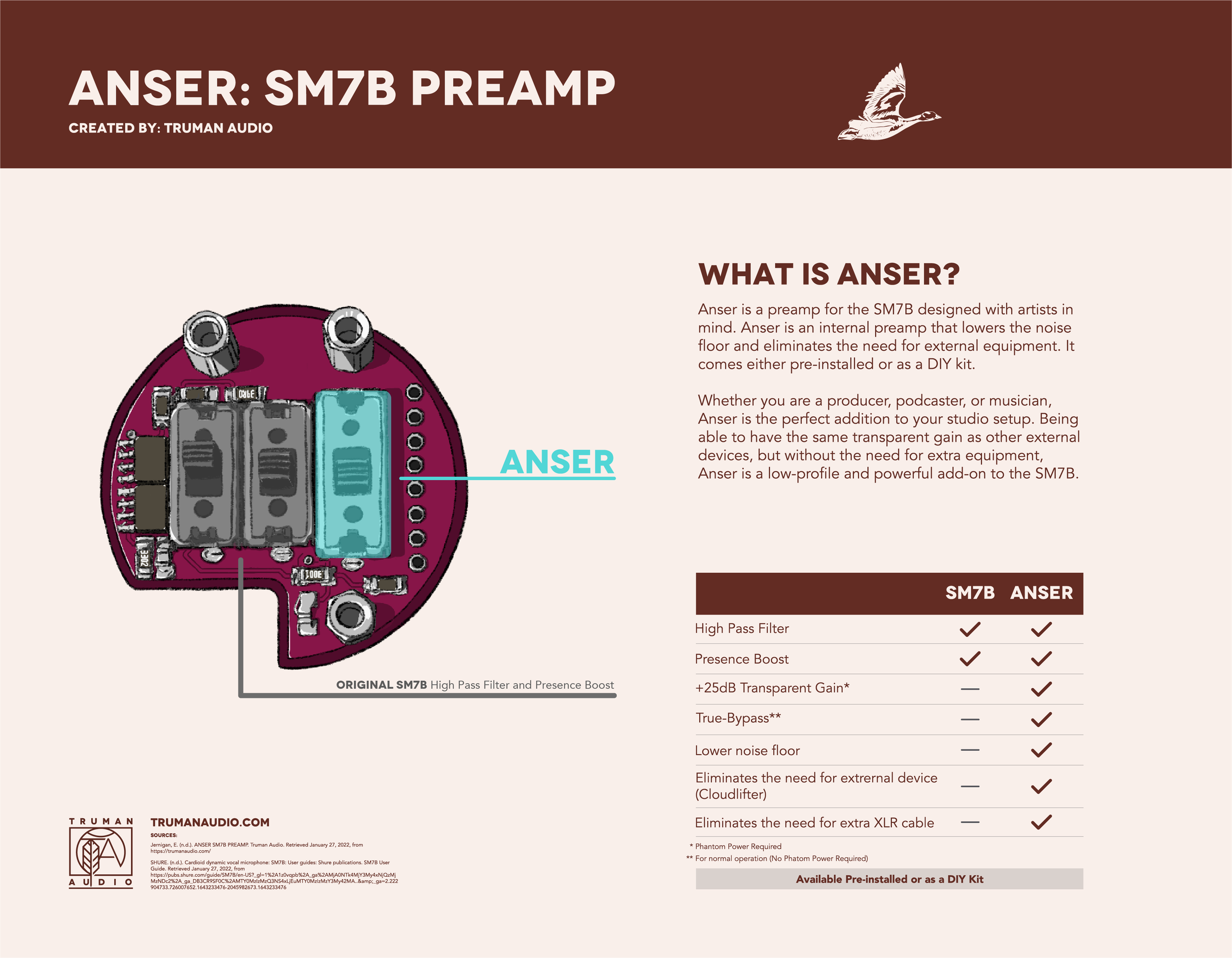 Anser is a preamp for the SM7B designed with artists in mind. Anser is an internal preamp that lowers the noise floor and eliminates the need for external equipment. It comes either pre-installed or as a DIY kit.
